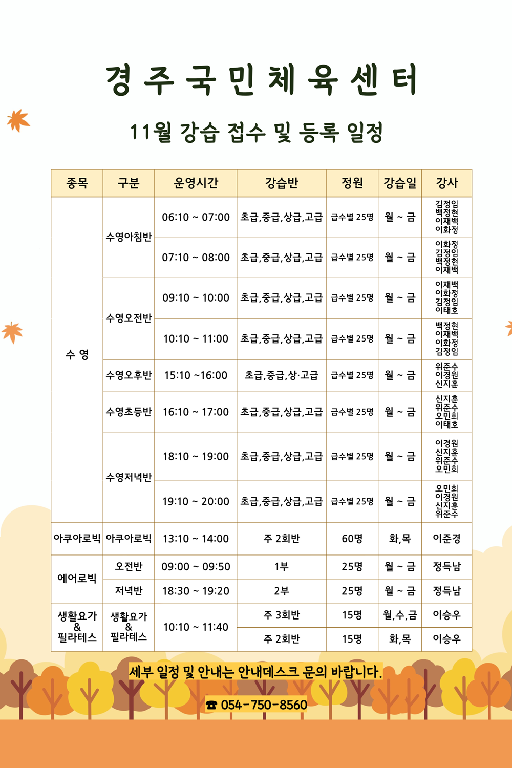 공지 11월 강습 프로그램 강사 안내 작성자 : 관리자 조회 : 27 등록일시 : 2025년 10월 24일 17시 24분 39초 11월강습-강사.png [ Size : 374.91KB, Down : 38 ] 미리보기 다운로드 목록보기