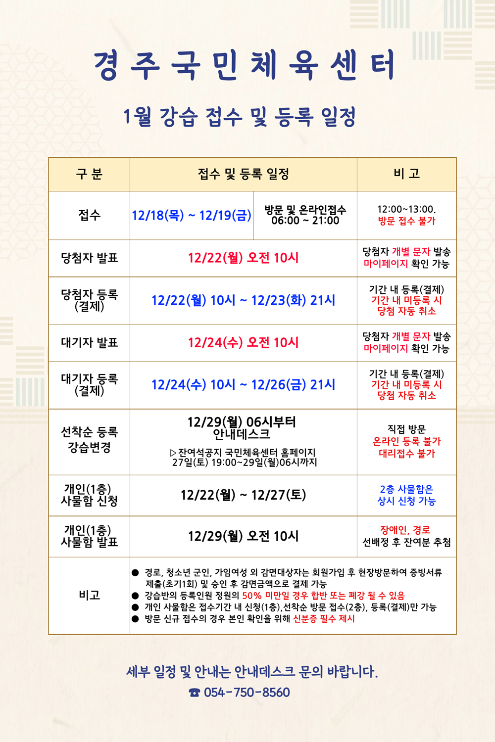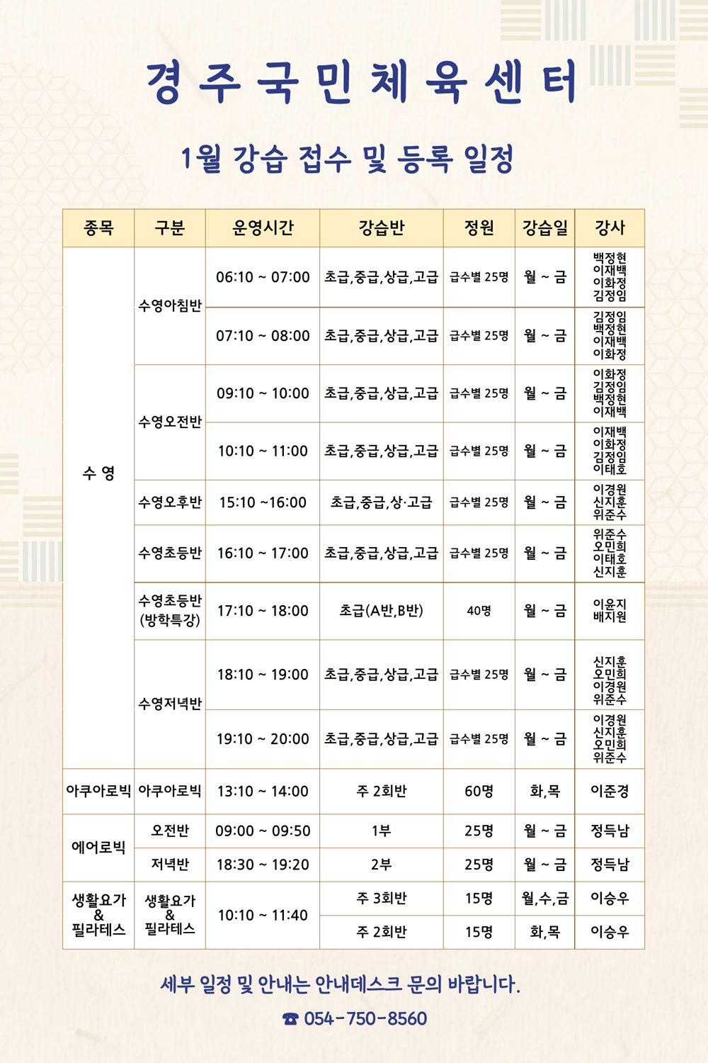공지 2026년 1월 강습 프로그램 및 접수 일정 안내 작성자 : 관리자 조회 : 1,227 등록일시 : 2025년 12월 14일 10시 39분 6초 1월강습p-001.png [ Size : 753.83KB, Down : 2,011 ] 미리보기 다운로드 1월강습p-002.png [ Size : 702.7KB, Down : 1,919 ] 미리보기 다운로드 목록보기