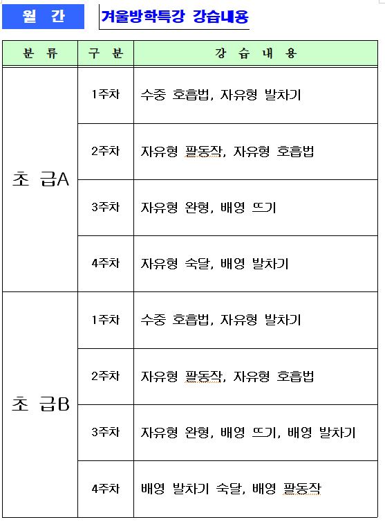 공지 초등반 겨울방학 특강 안내(강습내용 추가) 작성자 : 관리자 조회 : 706 등록일시 : 2025년 12월 12일 14시 6분 37초 초등반 겨울방학 특강.png [ Size : 197.02KB, Down : 922 ] 미리보기 다운로드 방학특강 강습내용.JPG [ Size : 61.82KB, Down : 801 ] 미리보기 다운로드 겨울방학특강 강습내용.hwp [ Size : 12KB, Down : 63 ] 다운로드 목록보기